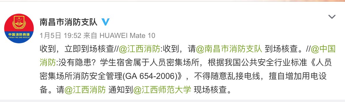 微博“中国消防”发现了安全隐患,为防止其他学生纷纷效仿,直接点名江西消防到现场核查,江西消防点名南昌是消防支队核查。